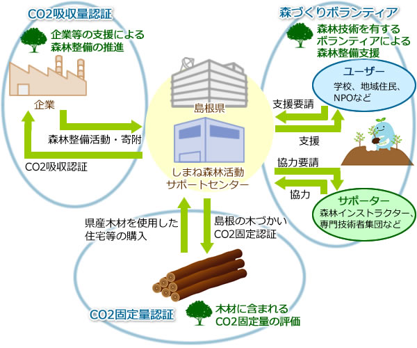 島根県の森林を守り、育て、次の世代へ引き継ぐ「森づくり」活動のために、 「森づくり」を支援して欲しいという人と 「森づくり」を支援したいという人を 結びつけるためのマッチングサイトです。
