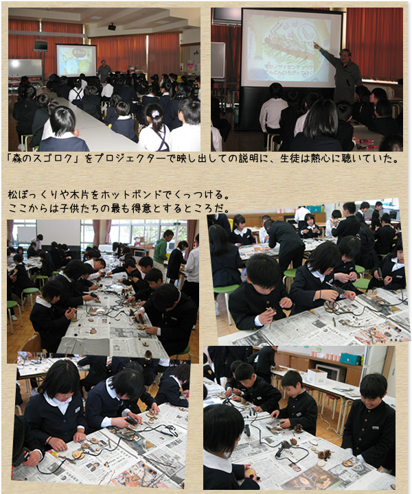 奥出雲町立阿井小学校の森林教室 2012年6月18日 最終更新日時 : 2025年9月26日 morimori 「森づくりスゴロク」を使って松枯れのメカニズム、広葉樹や針葉樹の管理・利用方法について学び、木片を使って木工工作を行った。 ユーザー名:奥出雲町立阿井小学校 開催日:平成24年5月12日(土) 開催場所:阿井小学校 サポーター名:(団体)NPOもりふれ倶楽部