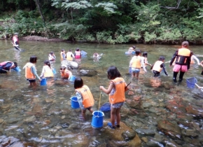 子供たちは「最初はどんなところか気になったけど、川は冷たくて気持ちよかったので又入りたいし、森を歩くのは大変だったけど、楽しい思い出ができました」「川での魚の捕り方を教えてもらって、実際に捕れたので嬉しかった。」「川の石がきれいでいっぱい集めました。又行きたいです。」「草笛が上手に吹けたのが一番楽しかった。コウモリも初めて見れて嬉しかった。」などと、初めて見聞きした体験を思い思いに楽しんだ様子を話してくれました。