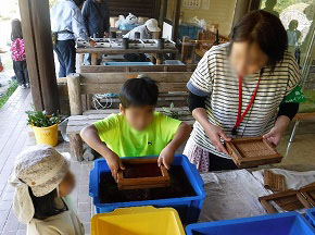 参加者からは、「笛は音を出すのが難しかった。」「花炭が簡単にできるとは思いませんでした。玄関に飾っておきます。」「木に登れて楽しかった。また来たいです。」「ネイチャートレイリングを初めてした。問題は難しかったけどとても楽しかった。」「紙漉きは初めてだったけどインストラクターの方が丁寧に教えてくださり楽しかったです。」などと、様々な体験や実演に取り組まれた感想を楽しそうに話していただきました。
